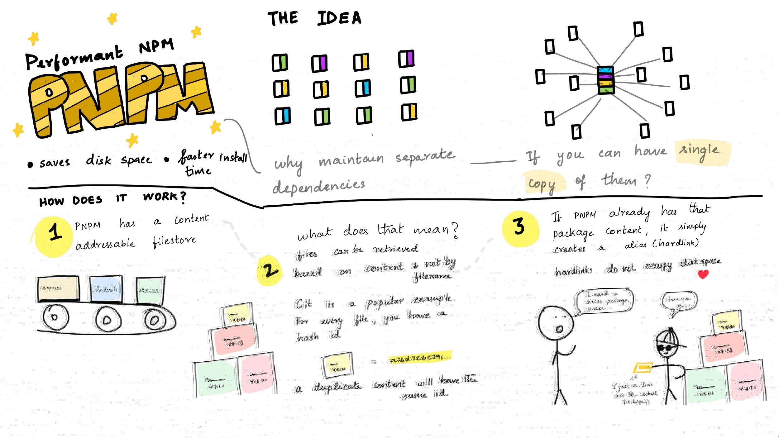 When using npm, if you have 100 projects using a dependency, you will have 100 copies of that dependency saved on disk. With pnpm, the dependency will be stored in a content-addressable store, so: